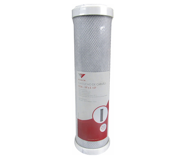 Cartucho de carvão utilizado para filtrar partículas de resíduos sólidos, reduzir o gosto indesejado e odores da água. Utilizado também para a redução do cloro livre e da turbidez da água.
